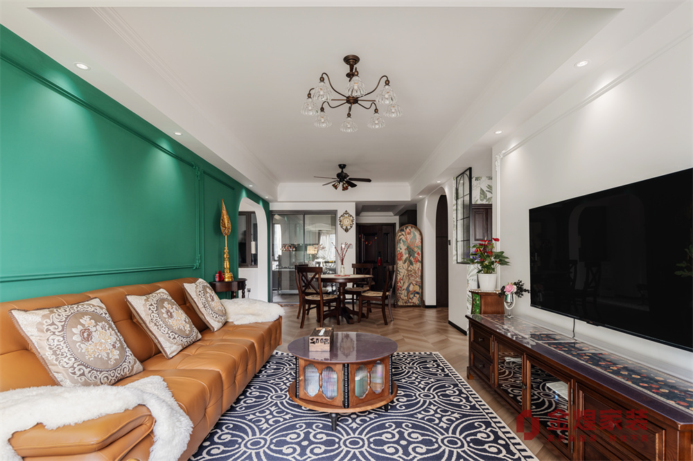 本案例拋棄傳統(tǒng)居家設(shè)計理念,設(shè)計風格為南洋復(fù)古風格,客廳做了一個開放式鋼琴房,餐廚區(qū)域做了一個整的7字形的櫥柜使空間最大化.