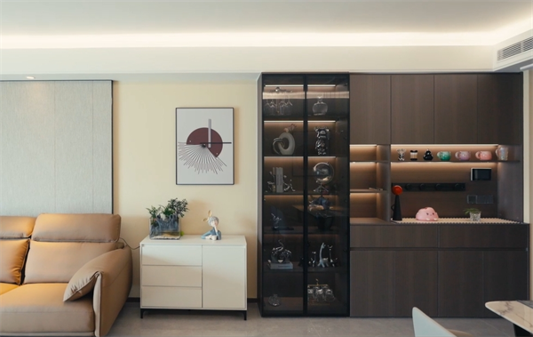 玄關(guān)處打造直紋深橡色玄關(guān)柜,做頂天立地設(shè)計(jì),增加儲(chǔ)物空間,膚感門板,質(zhì)感與實(shí)用并存,展現(xiàn)不凡品味。