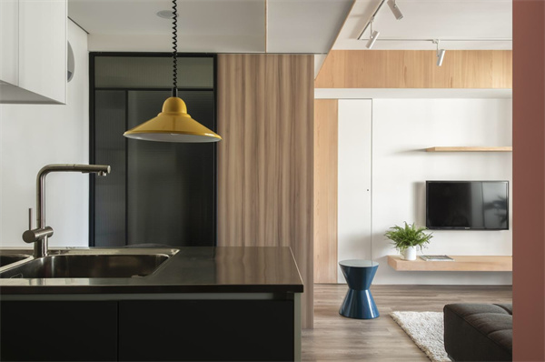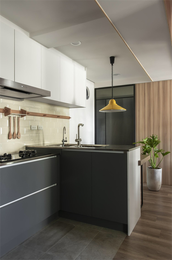 為節(jié)約空間,廚房采用半開放式設(shè)計(jì),各種廚具和儲(chǔ)物空間布局合理,白色吊柜搭配深色櫥柜,形成鮮明的對(duì)比,既簡約又富有層次感。大面積的臺(tái)面空間提供充足的操作空間,更融合了家庭生活的溫馨和舒適,在烹飪和用餐中盡情享受家的溫暖。