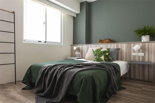 深綠色背景墻為房間增添了一抹生機(jī)和深度,仿佛將自然的寧靜引入室內(nèi)。大窗戶將充足的自然光線引入室內(nèi),使空間明亮而通透,同時(shí)與室外的美景相連,享受愜意美好居家生活。