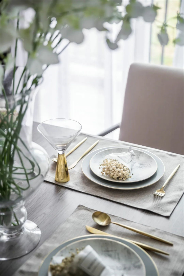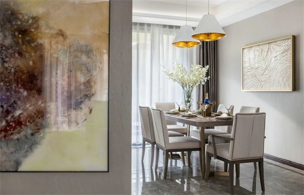 餐廳以淺色為主調(diào),中央擺放著一張長(zhǎng)方形仿木質(zhì)紋理的餐桌,桌面光滑細(xì)膩,散發(fā)出低調(diào)的奢華感。上方懸掛著一盞華麗的水晶吊燈,搭配桌上精心布置的金色餐具、細(xì)瓷餐盤(pán)以及充滿(mǎn)自然氣息的鮮花,營(yíng)造出溫馨而浪漫的用餐氛圍。