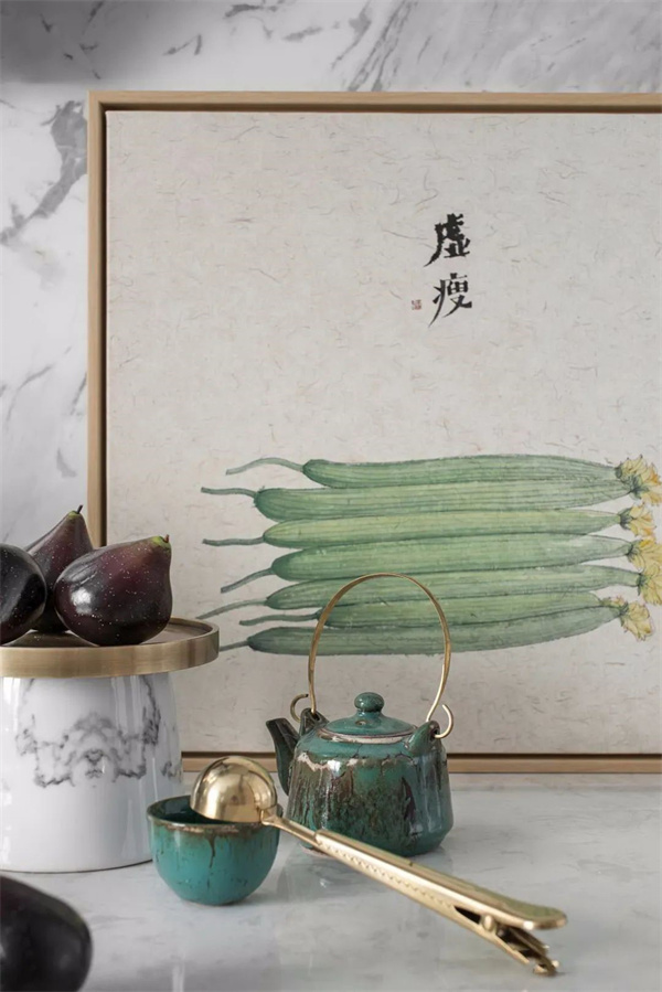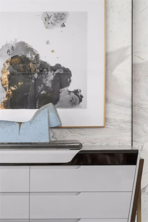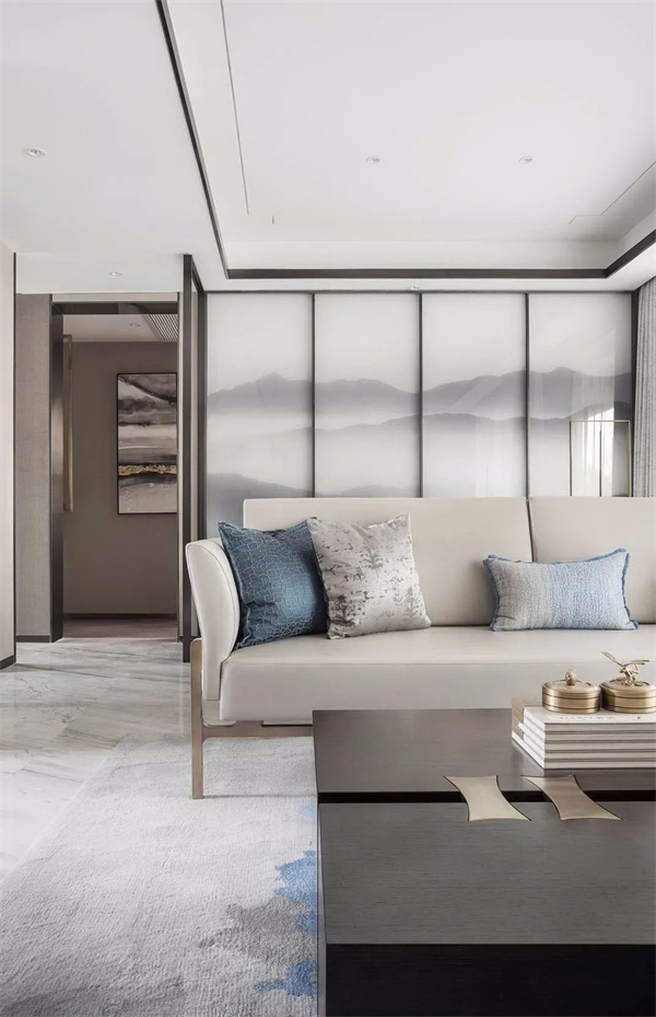 客廳整體空間呈現(xiàn)出簡潔明快的感覺,家具擺放合理,空間利用率高。硬朗的色系與山水畫的平和搭配,再配上黃銅材質(zhì)的點綴,提升了空間的飽和度與美感,古樸典雅的韻味氤氳其中。