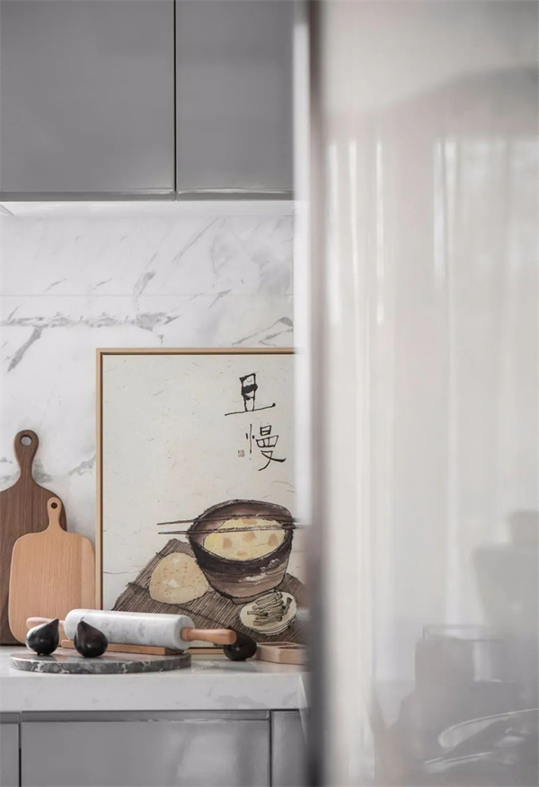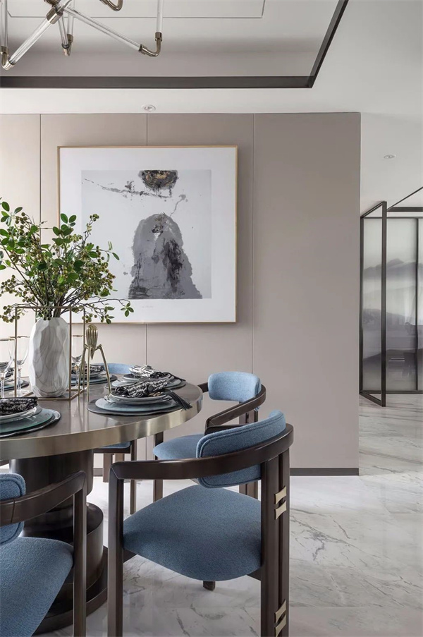 新中式餐廳布置,以天然材料的運用、色彩搭配的細(xì)致處理以及家具的精心選擇,使餐廳呈現(xiàn)出舒適、高品質(zhì)的用餐環(huán)境。背景墻上掛上一幅古韻山水畫,增加空間質(zhì)感,充滿了禪意的韻味。