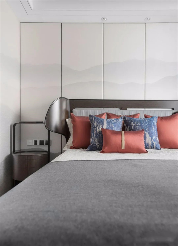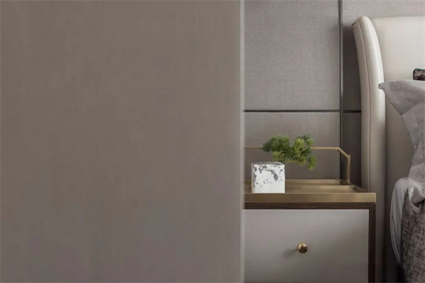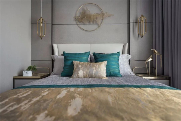 臥室的色彩以柔和、舒適的中性色為主,營造出寧靜、放松的氛圍。床頭做了大塊裝飾背景,背景墻的藝術(shù)裝飾與兩側(cè)黃銅材質(zhì)裝飾映襯,再搭配溫馨質(zhì)感有格調(diào)的軟裝布置,拉開空間的層次感。