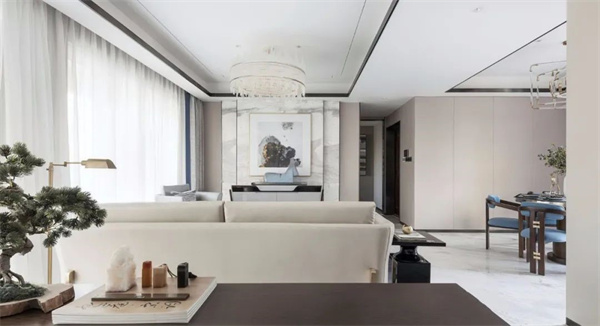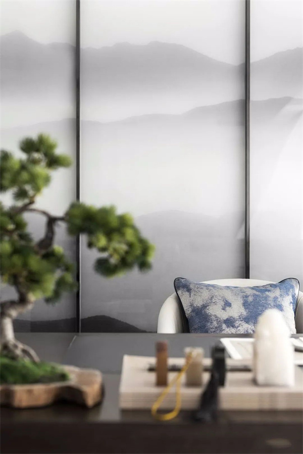 沙發(fā)墻在硬包基礎(chǔ)上加入詩意背景畫面,搭配新中式的沙發(fā),側(cè)邊配上坐椅、盆栽綠植的布置,使得整個客廳充滿著儒雅端莊的氛圍氣息。
