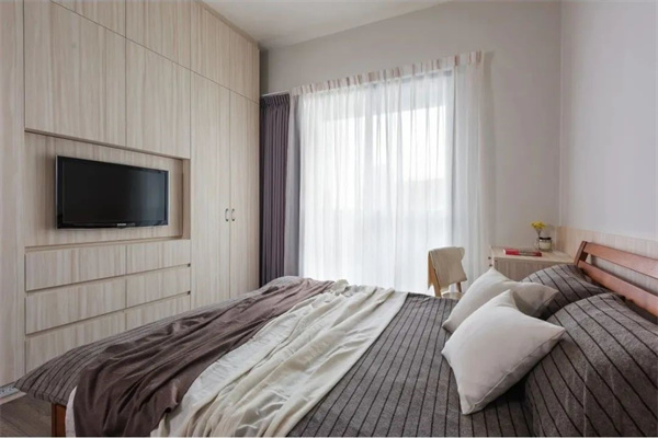主臥采用了極簡的設計語言,白色和淺灰色是主要色調(diào),突顯整體空間的清新與寬敞感。床品選擇了高質(zhì)感的純棉,搭配一些柔和的裝飾枕,營造出溫馨的氛圍。簡約的床頭柜和燈具設計,為主人帶來舒適輕松的睡眠空間。