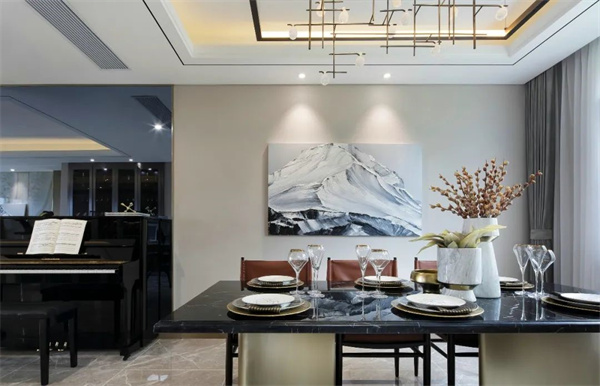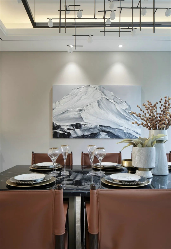 餐廳的餐桌椅采用深色調(diào),融合傳統(tǒng)工藝與現(xiàn)代簡約線條,獨(dú)具匠心。餐桌中央擺放著玻璃花瓶,里面插著新鮮的花卉,為餐廳增添了一份生機(jī)與色彩。頂部懸掛著精美吊燈,柔和的燈光灑在餐桌上,營造出溫馨的用餐氛圍。