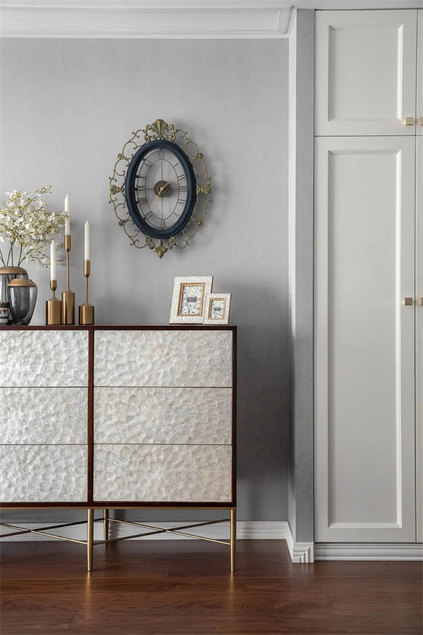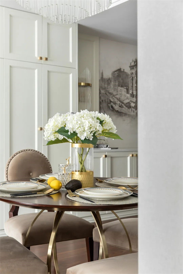 餐廳原木餐桌與布藝餐椅搭配精致的金屬吊燈,使餐區(qū)充滿現(xiàn)代感。餐邊柜上擺件和藝術(shù)鐘作為點(diǎn)綴,讓整個(gè)空間更具藝術(shù)氛圍。餐具的選擇注重精致和品質(zhì),搭配上鮮花裝飾,既簡(jiǎn)約又不失奢華。