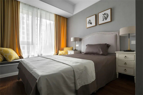 次臥以柔和的中性色調(diào)為主,搭配精致的金屬線條和獨(dú)特的軟包床頭,營(yíng)造出優(yōu)雅高級(jí)的溫馨氛圍。大面積的落地窗引入充足的自然光,窗簾則選用輕盈的絲質(zhì)材質(zhì),增強(qiáng)通透感和舒適度,賦予空間獨(dú)特的優(yōu)雅氣質(zhì)。