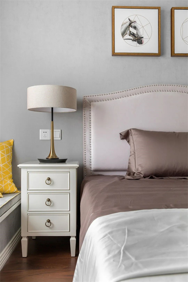 主臥采用淺色調(diào),以米白和灰為主,打造出溫馨的氛圍。床頭背景墻采用精致的軟包裝飾,增添層次感。軟裝以高質(zhì)感的面料為特色,搭配一些金屬工藝的家居裝飾,呈現(xiàn)出簡(jiǎn)約中不失品質(zhì)的輕奢感。