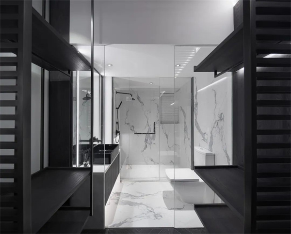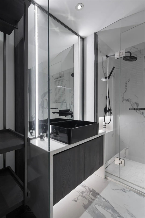 衛(wèi)生間整體采用中性色調,干濕分離維持空間整潔。淋浴區(qū)采用透明玻璃隔斷,進一步擴大了視覺空間感,同時突顯出極簡風格的功能性與時尚感。整個衛(wèi)生間設計在冷靜中展現了舒適與實用的完美平衡。