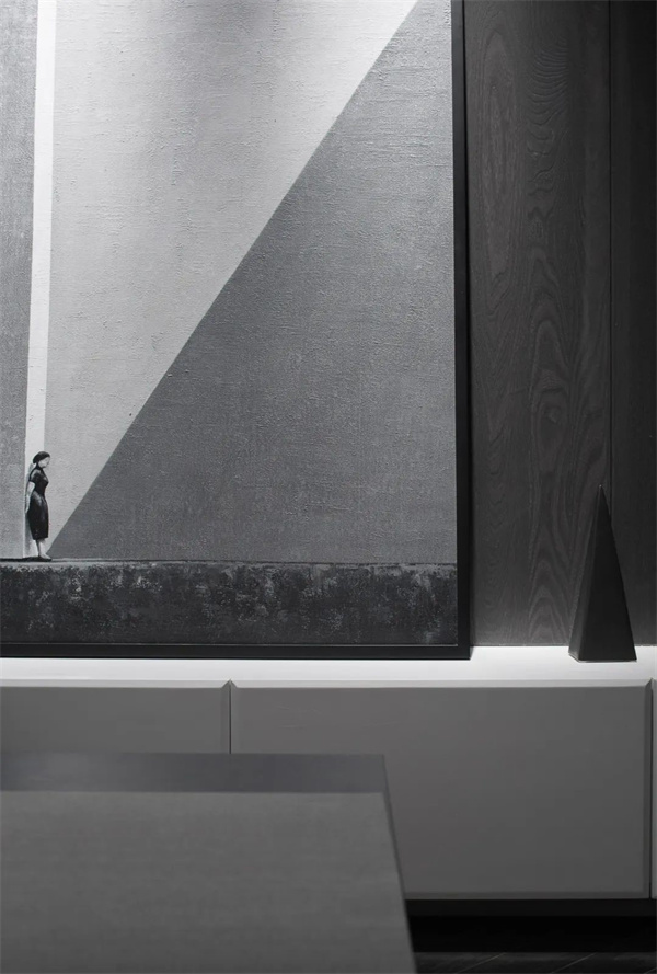 茶室墻面采用淺灰色裝飾,保持了視覺的連貫性。墻上掛了一幅抽象藝術畫,增添藝術感,卻不打破整體的寧靜。茶具擺設簡約考究,陽光透過白紗窗簾灑入室內,空間顯得靜謐而通透,是一處既適合獨自品茗又適合會客的理想場所。