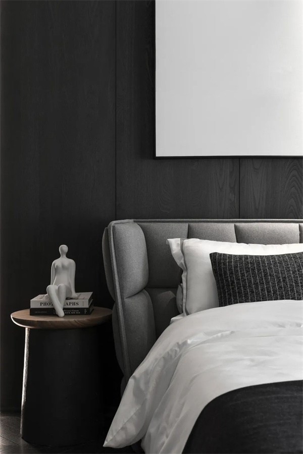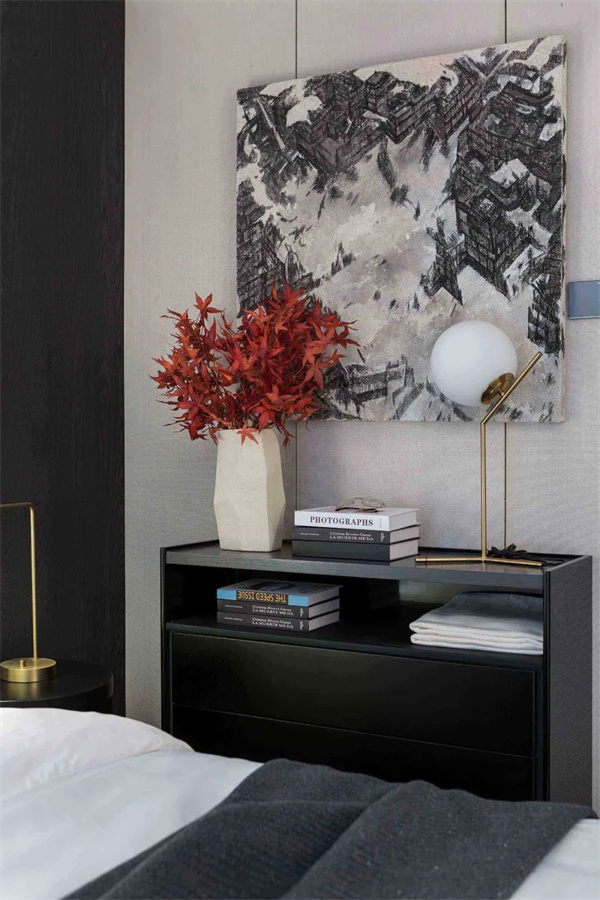 次臥延續(xù)了黑白灰的主色調,以簡約的設計凸顯現代感。簡潔的床頭背景墻上做了獨特的抽象風格設計,與房間的整體氛圍完美契合,增添了一抹藝術氣息。