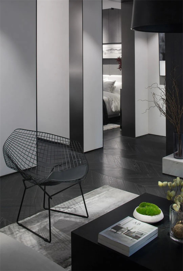 客廳空間巧妙運用了明亮的白色墻壁+深色地板,與家具的黑白搭配相互映襯,勾勒出一個安靜、理性的居住氛圍。沒有多余的裝飾,每一處線條都極為利落,彰顯極簡風格下的獨特品味與質感。
