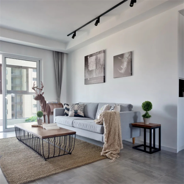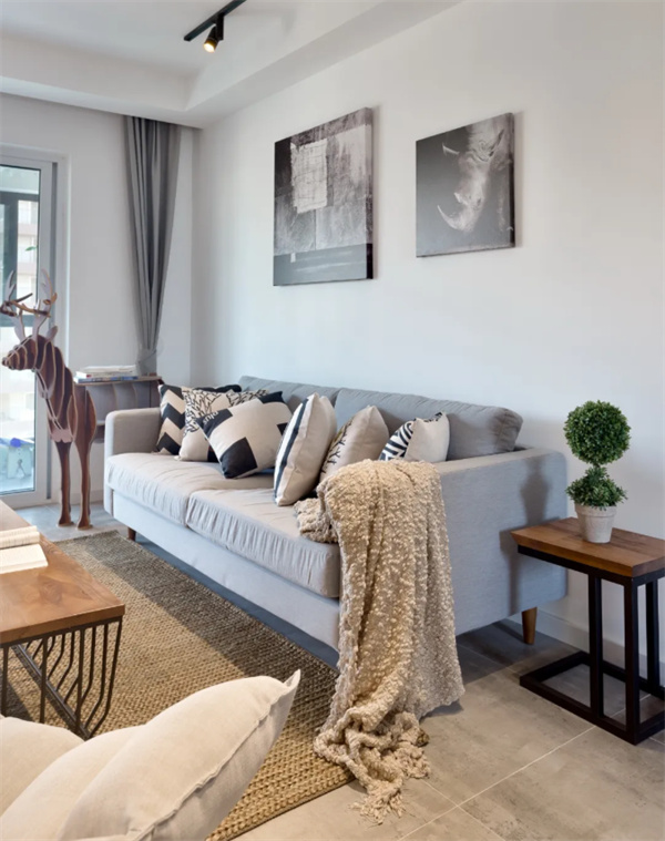 客廳整體采用了白色墻壁,使整個(gè)空間更加明亮和開(kāi)放?;疑卮u增加了室內(nèi)的深度和溫暖感。家具采用原木色,強(qiáng)調(diào)自然元素。舒適的灰色沙發(fā)和裝飾枕頭為客廳增添了溫馨感。墻上的裝飾物和藝術(shù)品展示著北歐設(shè)計(jì)的獨(dú)特元素,為空間增添了個(gè)性。