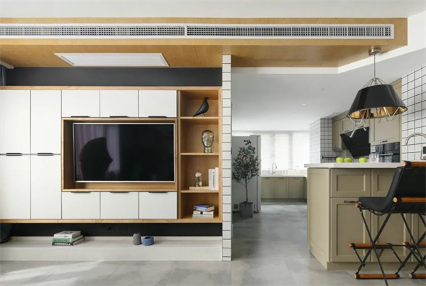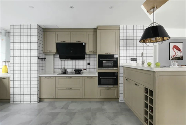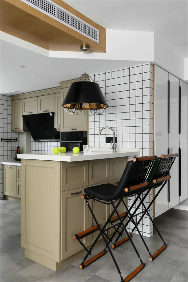 半開放式廚房空間開闊,以白色臺面與原木色柜體搭配,使用了小型的白色墻磚鋪貼,增加了層次感,定制化櫥柜設(shè)計讓空間收納更加簡潔有序。