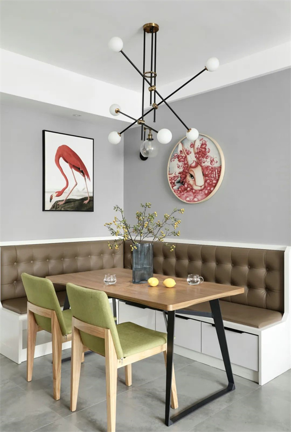 餐廳一張簡約的原木餐桌搭配柔軟布藝座椅,彰顯出純粹與質(zhì)樸的設(shè)計美學。桌上一束新鮮的野花靜靜綻放,為空間注入田園的清新氣息,配合柔和的燈光,讓每一次用餐,都是美味與幸福的交融,每一個瞬間,都是家的溫暖定格。