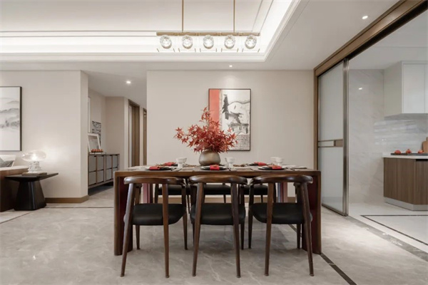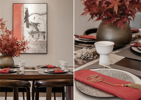 餐廳的餐桌椅采用原木材質(zhì),融合傳統(tǒng)工藝與簡約線條,餐桌上擺放著精致的餐具和紅楓盆栽,墻面懸掛著一幅傳統(tǒng)水墨風畫作,充滿東方韻味和現(xiàn)代雅致的裝飾細節(jié),讓空間散發(fā)著獨特的魅力。