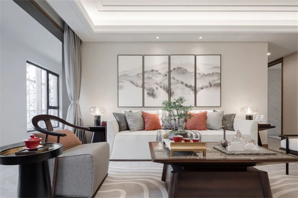 整個客廳以淺色為主調(diào),巧妙地搭配深色家具和傳統(tǒng)中式擺件,營造出優(yōu)雅別致的氛圍。中央擺放一張紅木茶幾,而沙發(fā)背景墻則裝飾著一組水墨山水畫,將寧靜和諧的氛圍完美呈現(xiàn)。