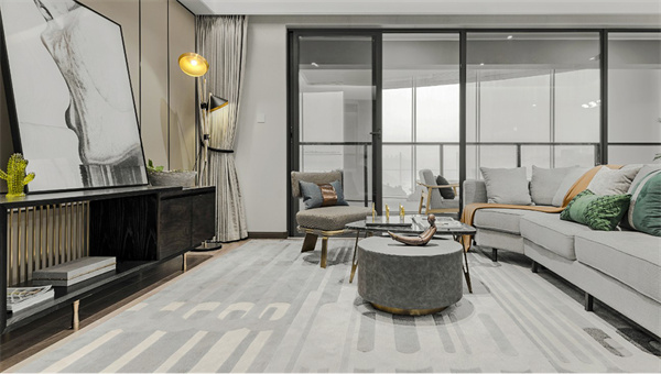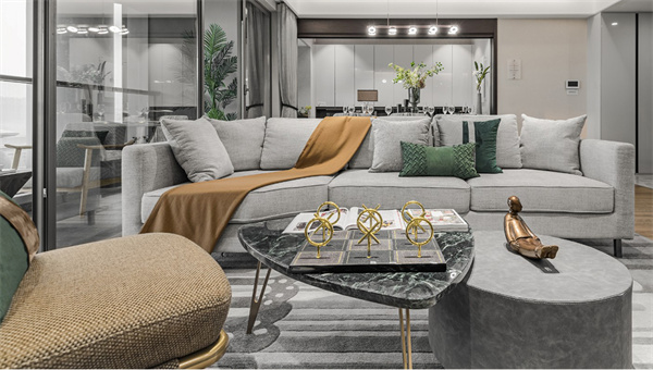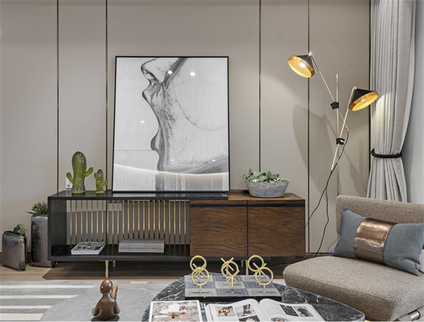 本案采用灰白中性色搭配原木地板為主色調(diào),營造清新簡約的空間氛圍。室內(nèi)家具選用了簡約設(shè)計的灰白色系,搭配金屬材質(zhì)的細節(jié)裝飾與綠植,使整體空間更顯現(xiàn)代感和奢華感。
