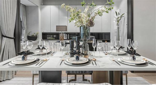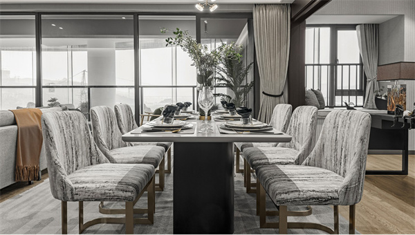 餐廳延續(xù)客廳的風格,將定制柜的美觀與實用性發(fā)揮得淋漓盡致。現(xiàn)代感十足的燈具將溫暖的光線投射到大理石餐桌和布藝餐椅上,營造出舒適的用餐氛圍。開闊的陽臺風格和清新的綠植為餐廳增添自然美景,讓美食與美景的享受在此刻達到巔峰。
