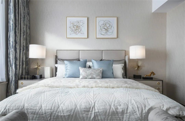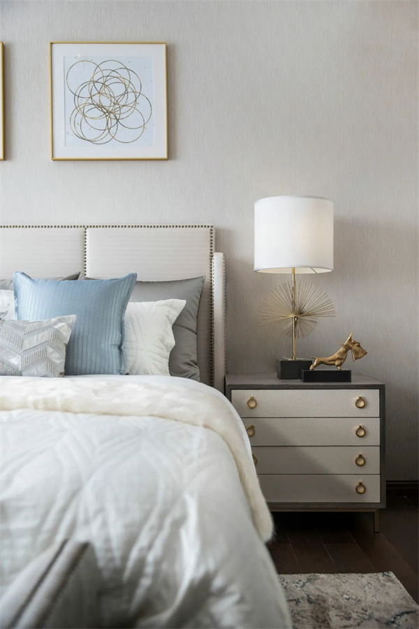 次臥以柔和的淺灰色和象牙白為主色調(diào)。床上鋪設(shè)著柔軟的棉麻床品,搭配著幾只絲綢抱枕,帶來舒適而奢華的觸感。大窗戶配有輕紗窗簾和厚重的絨布窗簾,既能保證充足的光線,又能在需要時提供私密性。