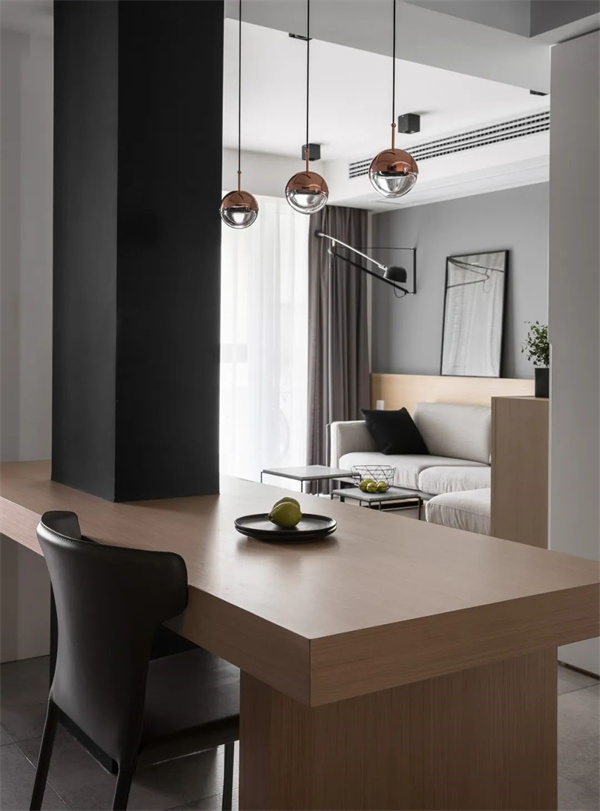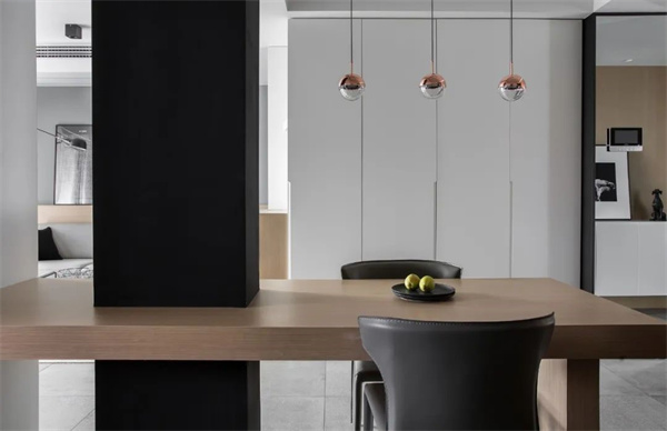 黑、白、灰的裝飾元素在餐廳中得到了精致展現(xiàn)。白色的墻面與灰色地磚組合,簡(jiǎn)約高級(jí)的原木餐桌搭配深灰色皮質(zhì)餐椅,呈現(xiàn)出現(xiàn)代感與溫馨感的完美平衡。