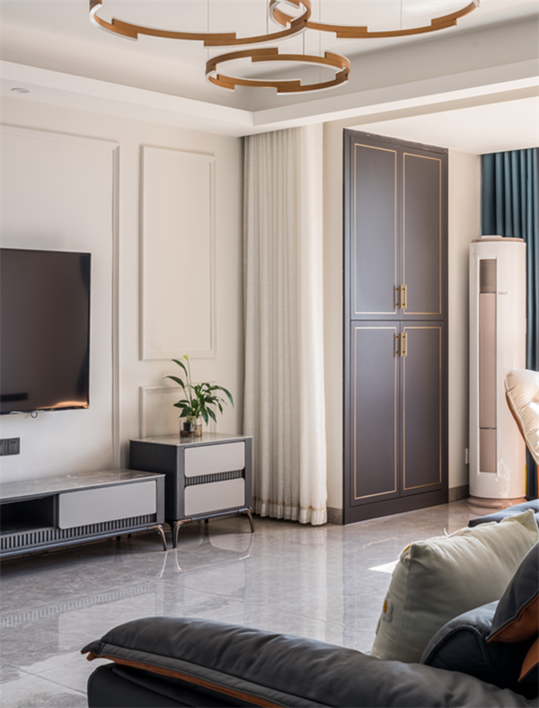 客廳灰色地磚與簡潔墻面空間結合,搭配灰色皮藝沙發(fā),而電視墻則是以白色飾面板為背景,壁掛上電視機,呈現(xiàn)出簡潔大方的格局。陽臺上色彩明亮的窗簾搭配暖色布藝沙發(fā),帶來的是簡約的優(yōu)雅空間感,縱享愜意時光。