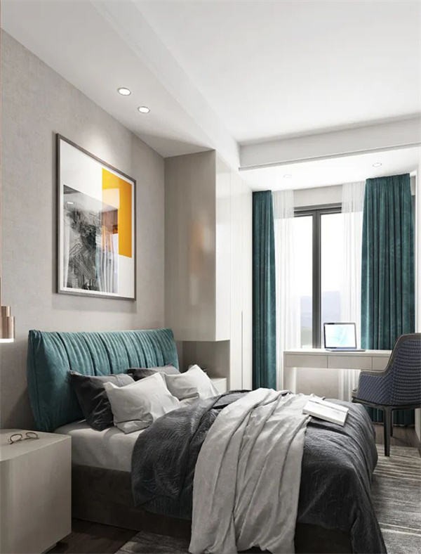 主臥室以中性色調(diào)為主,墻面白+灰組合,地板采用深色木質(zhì)元素搭配灰色床品,床頭配有現(xiàn)代質(zhì)感的收納柜,為主人提供額外的儲物空間。陽光通過大大的飄窗灑入房間,為整個空間帶來了溫暖和明亮。