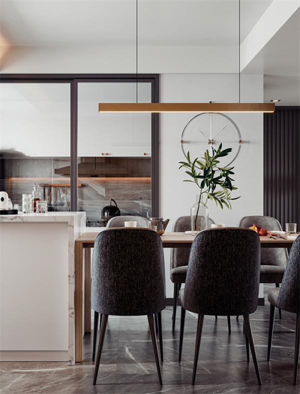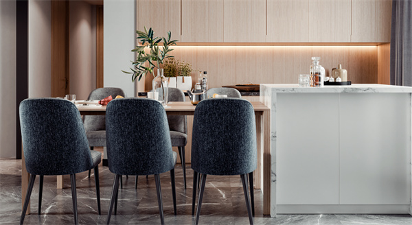 餐廳與客廳相連,采用了開放式布局這個設計充滿層次感。島臺選用與客廳電視背景同款的大理石,作為呼應的原木色餐桌搭配六把布藝餐椅,簡潔的設計,賦予餐廳簡約大氣的質(zhì)感,帶來不流俗的個性格調(diào)。