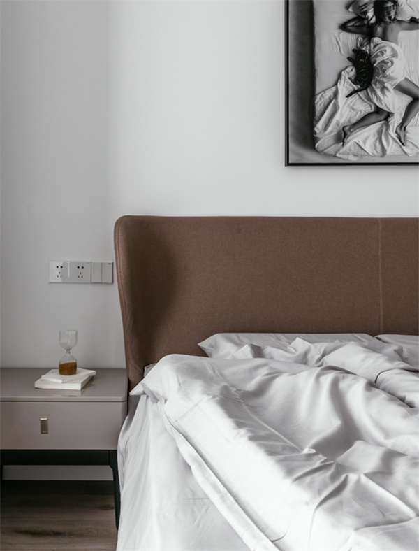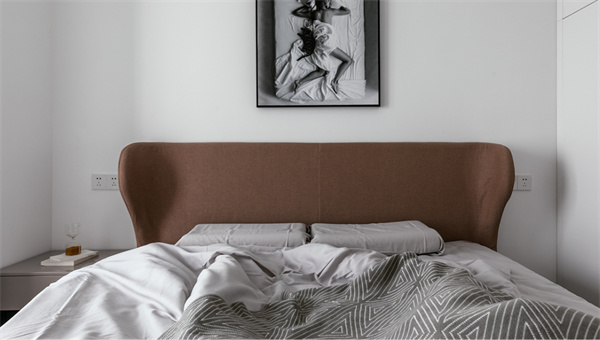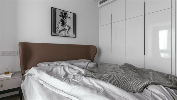 主臥延續(xù)了現(xiàn)代簡(jiǎn)約風(fēng)格的設(shè)計(jì)理念,以寧靜舒適為主題房間鋪設(shè)了溫暖的原木地板,給人一種自然質(zhì)樸的感覺。床頭背景墻采用白色+灰色掛畫的組合設(shè)計(jì),既顯得沉穩(wěn)大氣,又增加了空間的層次感。