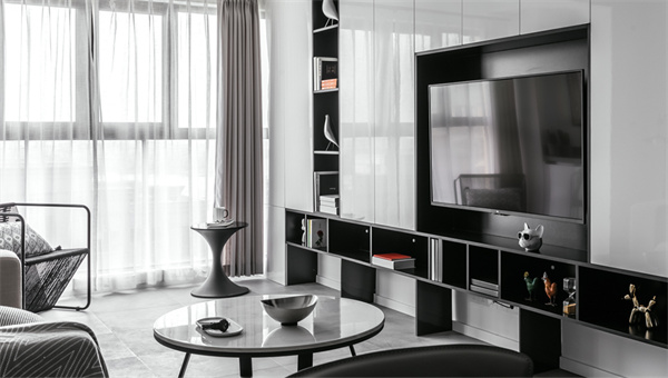 客廳墻壁和天花板都采用純白色裝飾,設(shè)計(jì)師巧妙地運(yùn)用了黑白相間的電視背景墻,增添了一絲現(xiàn)代感和視覺層次感。寬大的窗戶將自然光線引入室內(nèi),中性色的大理石地板為空間增添了質(zhì)感和豪華感。