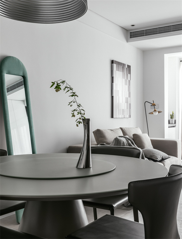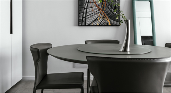 餐廳采用深色餐桌和現(xiàn)代風(fēng)格的椅子,灰色皮藝餐椅為用餐區(qū)增添舒適感。頂部懸掛著精致的吊燈,提供柔和的照明,配和墻面裝飾藝術(shù)作品,為空間增添了一抹現(xiàn)代感。
