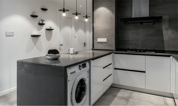 廚房采用半開放式設(shè)計(jì)的黑白灰配色方案。櫥柜選用白色柜面和灰色臺(tái)面組合,搭配嵌入式電器,創(chuàng)造出極簡(jiǎn)的外觀同時(shí),灰色大理石紋路的地板與墻面,也為廚房增添了質(zhì)感。