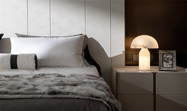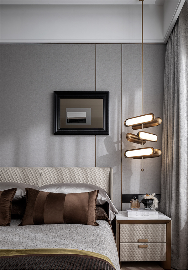 主臥空間散發(fā)著一種優(yōu)雅與舒適并存的氛圍質(zhì)感。柔軟的床和精致的床頭背景設(shè)計,營造出輕奢質(zhì)感。床頭擺放著精美家居飾品,暖色的臺燈搭配裝飾畫,增添了空間的雅致感。