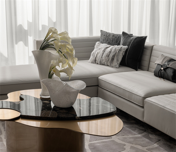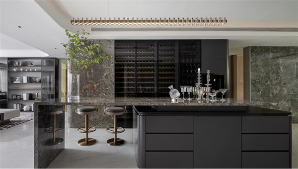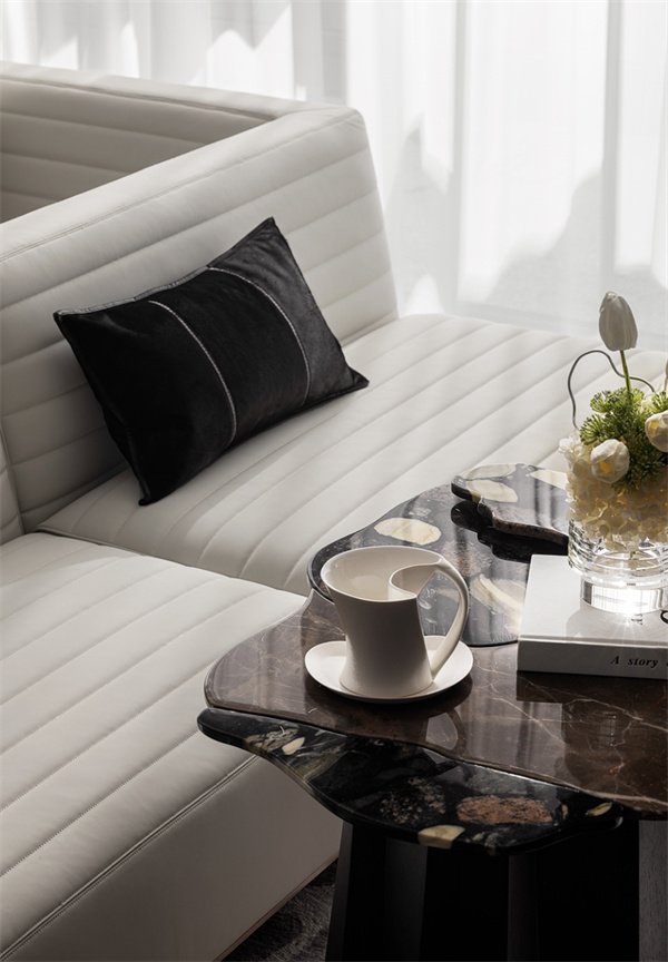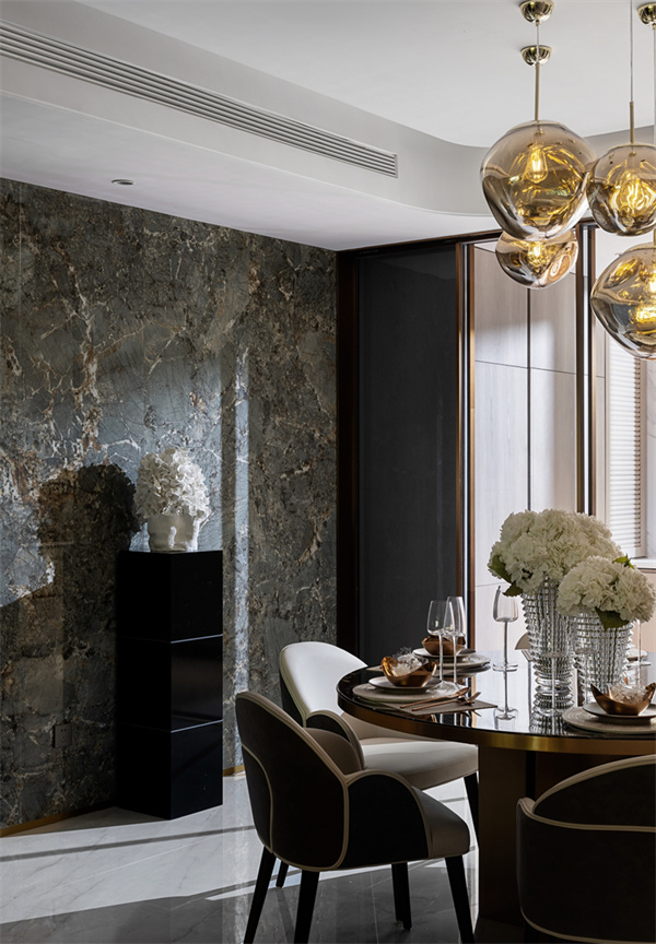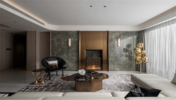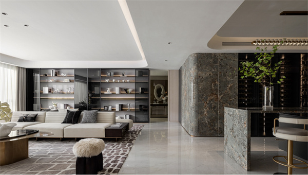 客廳以奢華和舒適為特點,注重細節(jié)和藝術(shù)品味。大理石地板和潘多拉的巖板的鏤空式墻壁飾面設(shè)計,營造出高貴的質(zhì)感。軟裝設(shè)計上選用簡潔干凈的布置溫潤、素雅且低飽和度的色彩搭配,讓整個空間充滿高級的溫柔感。