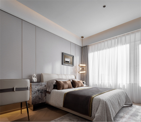 窗紗采用輕薄的布料,自然光線透過窗戶酒進房間,與墻面的色彩相融合,增添清新明亮的感覺,營造出寧靜、優(yōu)雅的休息空間。