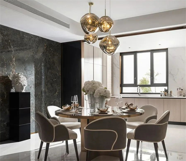 意式輕奢餐廳強調(diào)用餐空間的舒適和尊貴感,圓型餐桌和華麗的金色藝術(shù)吊燈展現(xiàn)出奢華的氛圍。且充分利用自然光線,讓整個空間更加開闊明亮,打造出一個與家人和朋友共享美食的完美場所。
