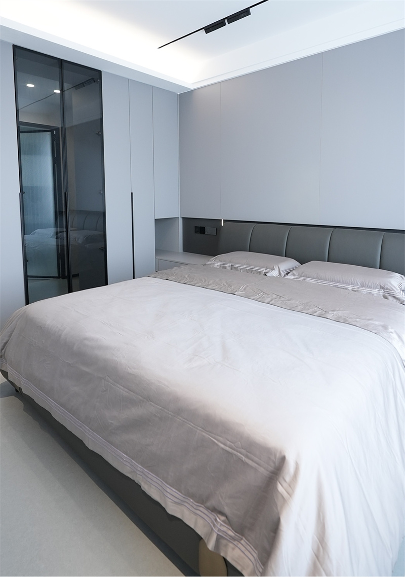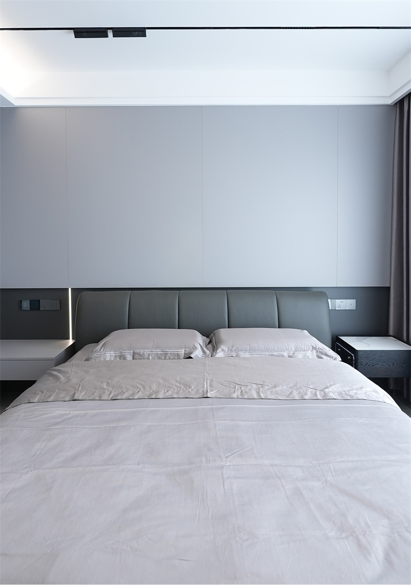 主臥選用灰色系地板,搭配上深色的皮藝床和床品,還有一體定制化的衣柜,整個(gè)空間簡(jiǎn)潔舒適。輕松大方的床頭背景墻的飾面材料,搭配低溫暖調(diào)燈光,烘托出精致的私密氛圍,呈現(xiàn)克制、舒適的空間美學(xué)。