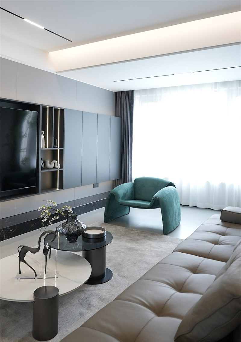 客廳以極簡(jiǎn)的設(shè)計(jì),加上高級(jí)灰的配色,呈現(xiàn)出現(xiàn)代舒適與愜意寬敞的氛圍。墻面采用水泥灰質(zhì)感的設(shè)計(jì),擺上一張棕色皮藝沙發(fā),加上一張巖板茶幾,高級(jí)黑的電視墻一側(cè)設(shè)計(jì)有壁掛式書(shū)架,提供了靈活的收納,整個(gè)空間顯得極簡(jiǎn)低調(diào)而高級(jí)大氣。