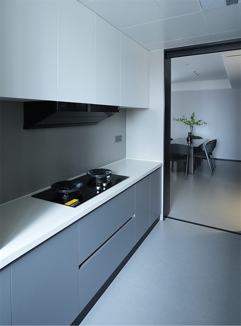 廚房設(shè)計(jì)成L形的操作動(dòng)線?;野咨牡孛娲u,加上同色系的一體化定制櫥柜讓?zhuān)瑥N房顯得格外的時(shí)尚雅致。全套定制與嵌入式廚電設(shè)計(jì),更讓做烹飪空間也顯得整潔而方便實(shí)用。