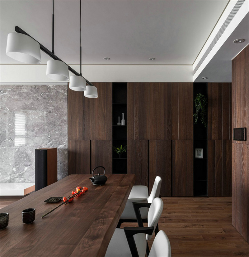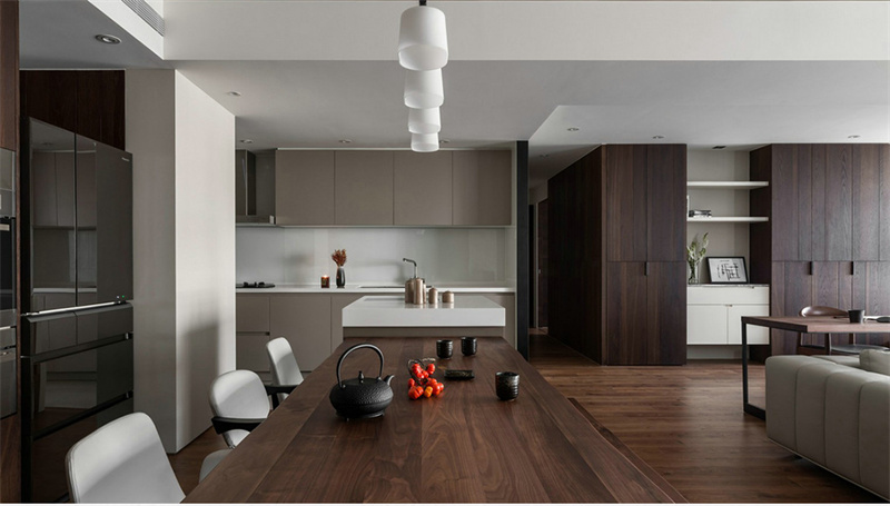 餐廳延續(xù)了極簡風格,以簡約的餐桌和現(xiàn)代餐椅為特色,搭配白色定制柜,兼具了裝飾與收納功能,讓空間更加整潔協(xié)調(diào),創(chuàng)造一個純凈的用餐環(huán)境。