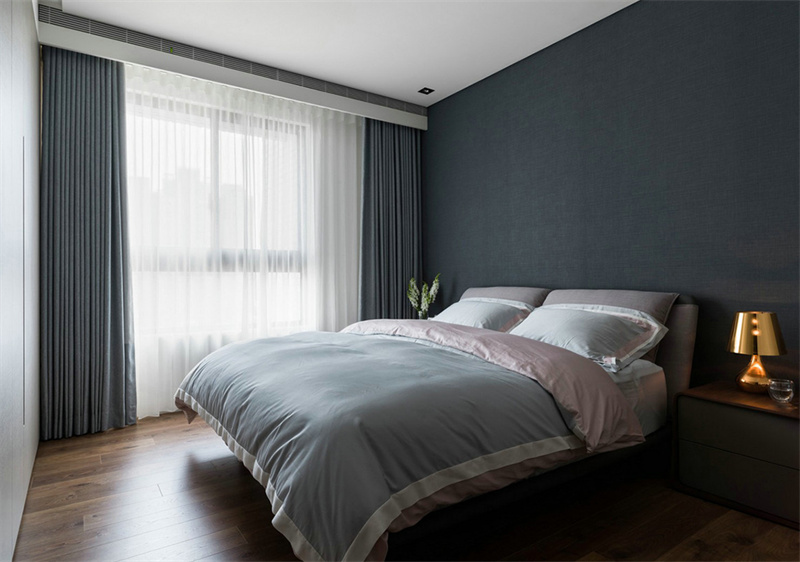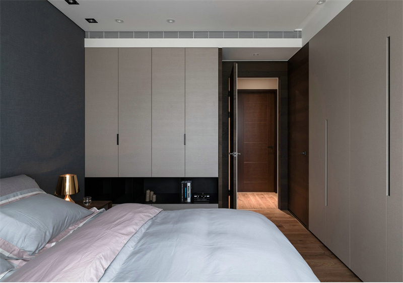 主臥室延續(xù)了整體的極簡風格,以原木色和灰白色的搭配為主,消除了多余的裝飾元素。白色的定制柜和藍灰色的床品,為臥室注入了寧靜的舒適感,通過精心設(shè)計的照明,讓空間充滿質(zhì)感和設(shè)計感。