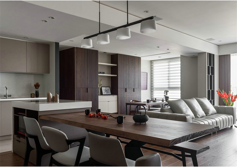 客廳墻面以白色為主,搭配原木色地板,突顯簡約與明亮。中性色調(diào)的大型沙發(fā)配以柔軟的抱枕,為家人和朋友提供了極致的舒適。空間點綴的綠植和插花,加上一組現(xiàn)代吊燈,提供了柔和而溫暖的光線增添了空間的品味感。