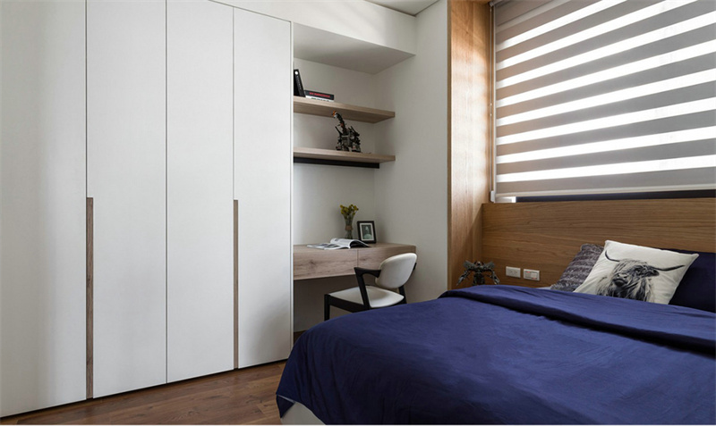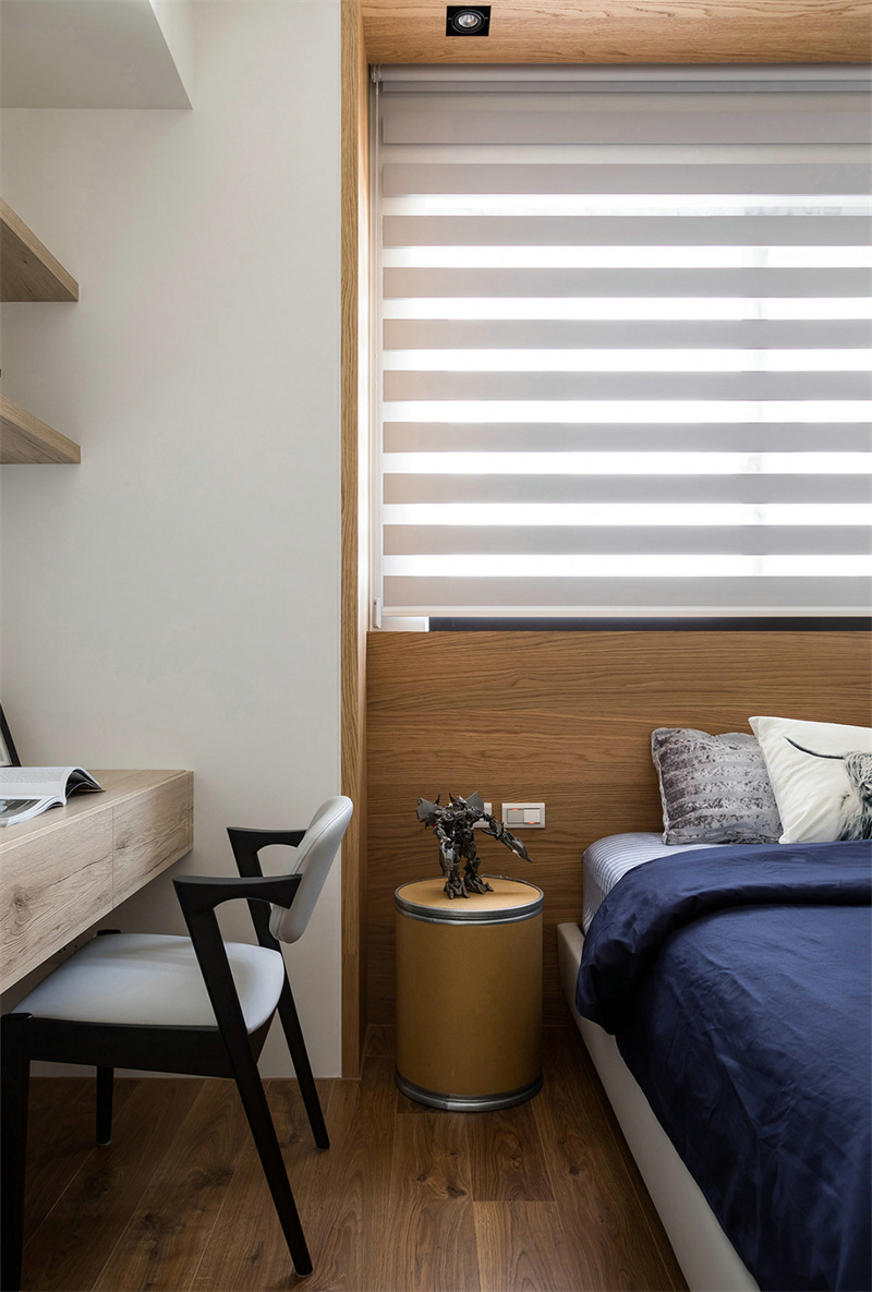 兒童房的書桌與定制柜采用一體化定制設(shè)計。軟裝上使用柔和的藍白組合作主導色調(diào),搭配原木色家具,保留了童真的活潑感,同時呈現(xiàn)現(xiàn)代簡約設(shè)計理念,為房間注入生氣和活力。