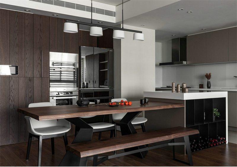 開放式廚房以簡潔和功能性為特點,廚房的中島吧臺與操作臺布局成的操作空間,為主人提供了方便舒適的烹飪場所。優(yōu)秀的采光條件不僅提供明亮的視線,更是增加了烹飪時的愉悅感。