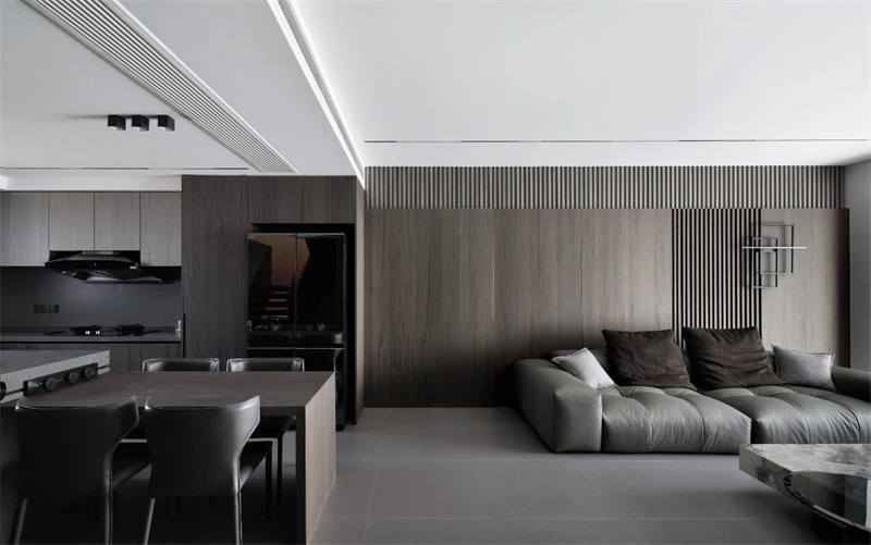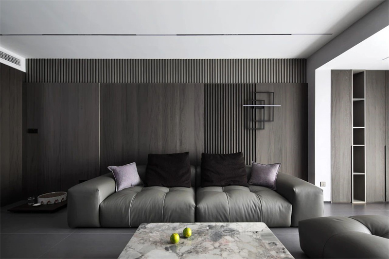 客廳以大面積的灰色調(diào)為主,搭配深色木質(zhì)墻面和地磚,展現(xiàn)出一種低調(diào)的奢華感?;疑べ|(zhì)沙發(fā)線條流暢、造型簡約,既舒適又不失時尚感,成為整個空間的視覺焦點。大理石茶幾設(shè)計簡潔大方,光滑細膩臺面反射出柔和的光澤,提升了空間的質(zhì)感與層次。
