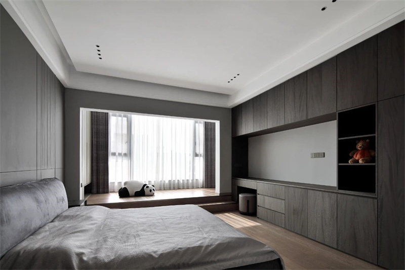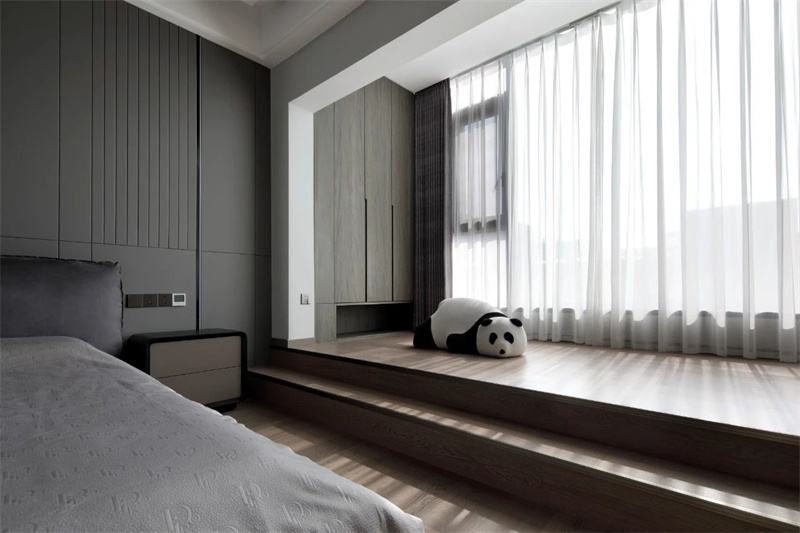 主臥以灰色和白色為主色調(diào),搭配溫暖的木質(zhì)地板,展現(xiàn)出一種低調(diào)的奢華感。床頭背景墻采用豎條紋設(shè)計,增加了空間的層次感和視覺深度。飄窗設(shè)計不僅實用,還為房間增添了一處悠閑的小角落,可以在此享受陽光、閱讀書籍或簡單冥想。